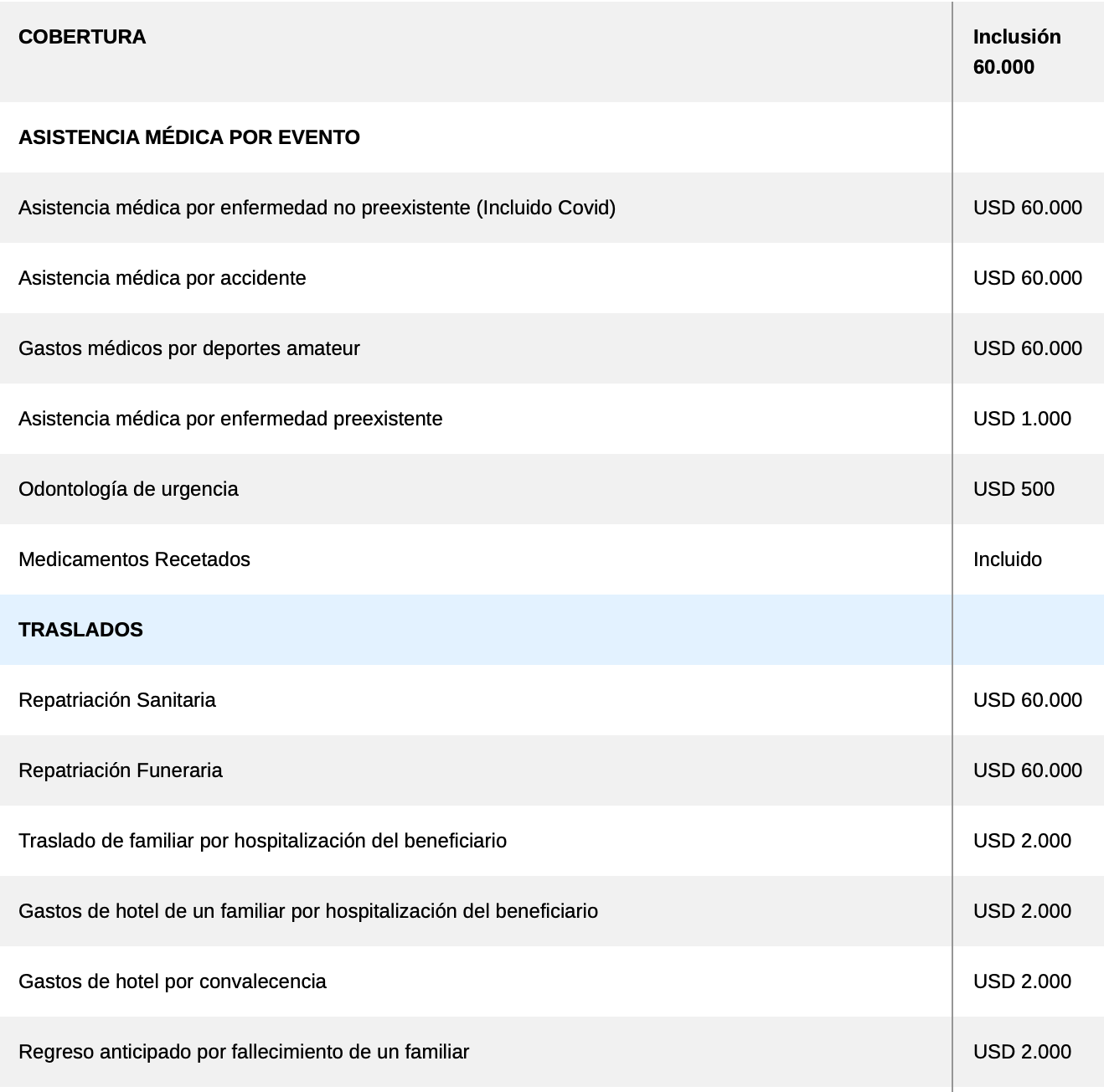 El presente programa incluye asistencia médica con cubrimiento de 60.000 dólares en caso de accidente o enfermedad no pre-existente con la compañía de asistencias GRUPO MOK. El cubrimiento es a nivel mundial excepto en el país de residencia del pasajero.