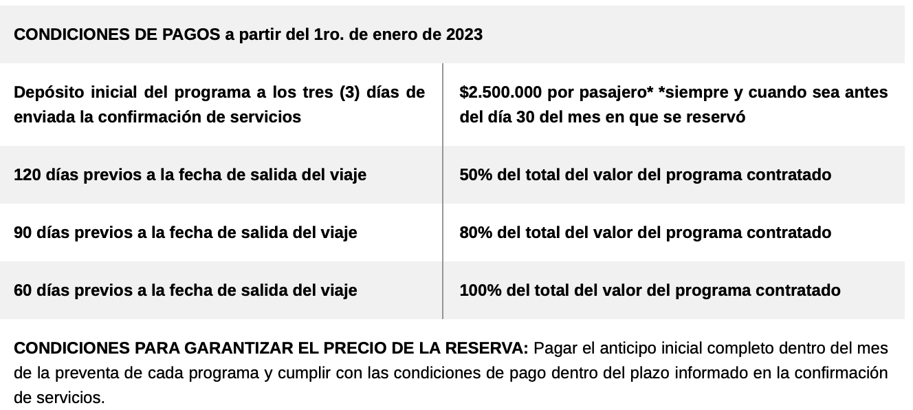 De no cumplirse y /o respetarse el plan de pagos aquí mencionados y confirmados en la liquidación de servicios, se hará reajuste en la tarifa acorde al valor que aplique en la preventa que esté vigente. En caso de cancelación de la reserva, aplican los cargos correspondientes sin previo aviso.